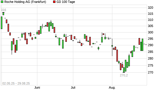 Mit dem Rücksetzer auf 291,00 EUR hat die Roche-Aktie am 28.08.2025 die 100-Tage-Linie nach unten gekreuzt.