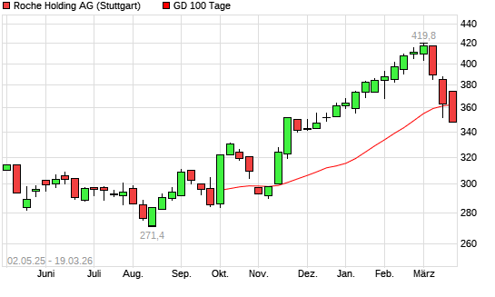 Mit dem Rücksetzer auf 350,40 EUR hat die Roche-Aktie am 18.03.2026 die 100-Tage-Linie nach unten gekreuzt.