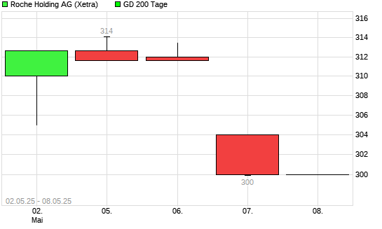 Mit dem Rücksetzer auf 307,40 EUR hat die Roche-Aktie am 07.05.2025 die 200-Tage-Linie nach unten gekreuzt.
