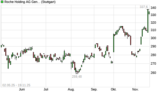 Mit dem Anstieg auf 338,90 EUR hat die Roche Genussscheine-Aktie (ISIN CH0012032048) am 18.11.2025 ein neues 3-Jahres-Hoch erreicht und damit den Kurs vom 04.03.2025 eingestellt.