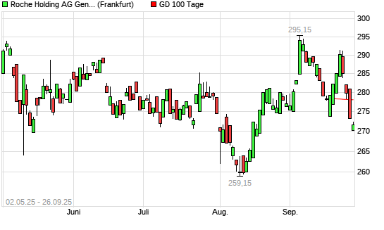Mit dem Rücksetzer auf 273,35 EUR hat die Roche Genussscheine-Aktie am 25.09.2025 die 100-Tage-Linie nach unten gekreuzt.