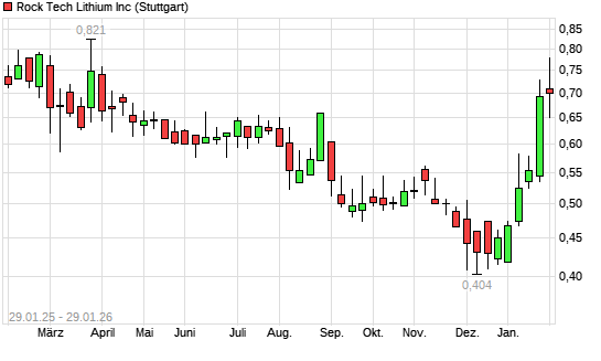 Mit dem Anstieg auf 0,73 EUR hat die Rock Tech Lithium-Aktie (ISIN CA77273P2017) am 28.01.2026 ein neues 6-Monats-Hoch erreicht und damit den Kurs vom 26.01.2026 eingestellt.Die Rock Tech Lithium-Aktie ...weiterlesen