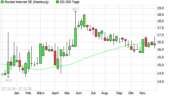 Mit dem Anstieg auf 16,90 EUR hat die Rocket Internet-Aktie am 26.11.2025 die 200-Tage-Linie nach oben gekreuzt.