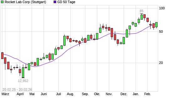 Mit dem Anstieg auf 66,00 EUR hat die Rocket Lab-Aktie am 19.02.2026 die 50-Tage-Linie nach oben gekreuzt.Der Abstand zur 200-Tage-Linie beträgt aktuell +45,32%.