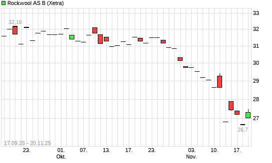 Mit dem Rücksetzer auf 26,48 EUR hat die Rockwool International-Aktie (ISIN DK0063855168) am 19.11.2025 ein neues 12-Monats-Tief erreicht und damit den Kurs vom 18.11.2025 eingestellt.