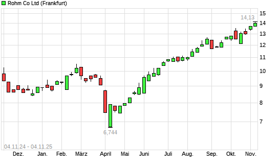 Mit dem Anstieg auf 14,13 EUR hat die Rohm-Aktie (ISIN JP3982800009) am 03.11.2025 ein neues 12-Monats-Hoch erreicht und damit den Kurs vom 31.10.2025 eingestellt.