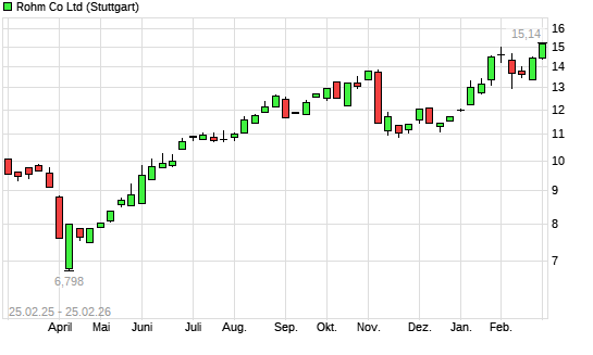 Mit dem Anstieg auf 14,77 EUR hat die Rohm-Aktie (ISIN JP3982800009) am 24.02.2026 ein neues 12-Monats-Hoch erreicht und damit den Kurs vom 27.01.2026 eingestellt.