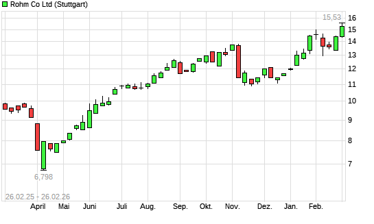 Mit dem Anstieg auf 14,93 EUR hat die Rohm-Aktie (ISIN JP3982800009) am 25.02.2026 ein neues 12-Monats-Hoch erreicht und damit den Kurs vom 24.02.2026 eingestellt.