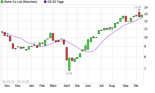 Mit dem Anstieg auf 12,49 EUR hat die Rohm-Aktie am 14.10.2025 die 50-Tage-Linie nach oben gekreuzt.