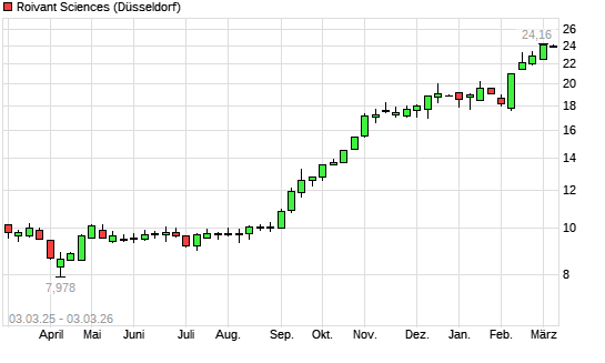 Mit dem Anstieg auf 24,04 EUR hat die Roivant Sciences-Aktie (ISIN BMG762791017) am 02.03.2026 ein neues All-Time-High erreicht und damit den Kurs vom 26.02.2026 eingestellt.