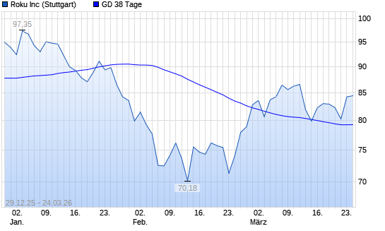 Mit dem Rücksetzer auf 78,27 EUR hat die Roku-Aktie am 23.03.2026 die 38-Tage-Linie nach unten gekreuzt.