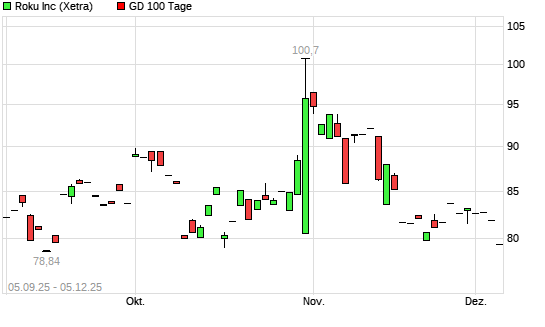 Mit dem Rücksetzer auf 80,20 EUR hat die Roku-Aktie am 04.12.2025 die 100-Tage-Linie nach unten gekreuzt.Die Roku-Aktie befindet sich seit dem 11.08.2025 im langfristigen Aufwärtstrend ...weiterlesen