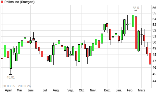 Mit dem Rücksetzer auf 46,54 EUR hat die Rollins-Aktie (ISIN US7757111049) am 19.03.2026 ein neues 6-Monats-Tief erreicht und damit den Kurs vom 24.09.2025 eingestellt.