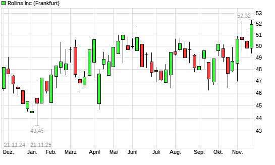 Mit dem Anstieg auf 51,98 EUR hat die Rollins-Aktie (ISIN US7757111049) am 20.11.2025 ein neues All-Time-High erreicht und damit den Kurs vom 04.06.2025 eingestellt.