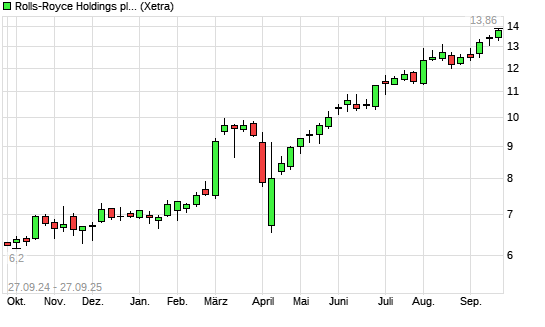 Mit dem Anstieg auf 13,88 EUR hat die Rolls-Royce-Aktie (ISIN GB00B63H8491) am 26.09.2025 ein neues 10-Jahres-Hoch erreicht und damit den Kurs vom 24.09.2025 eingestellt.