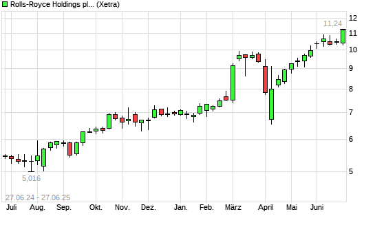 Mit dem Anstieg auf 11,16 EUR hat die Rolls-Royce-Aktie (ISIN GB00B63H8491) am 26.06.2025 ein neues 5-Jahres-Hoch erreicht und damit den Kurs vom 25.06.2025 eingestellt.