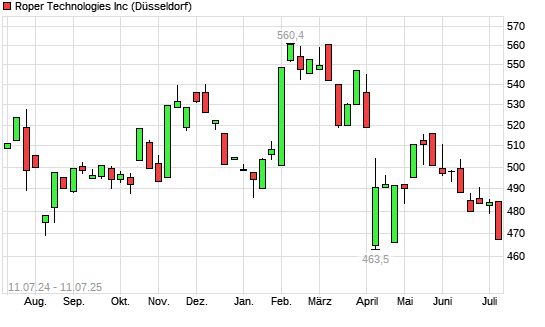 Mit dem Rücksetzer auf 463,50 EUR hat die Roper Industries-Aktie (ISIN US7766961061) am 10.07.2025 ein neues 12-Monats-Tief erreicht und damit den Kurs vom 09.04.2025 eingestellt.
