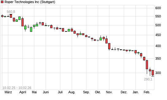 Mit dem Rücksetzer auf 290,50 EUR hat die Roper Industries-Aktie (ISIN US7766961061) am 09.02.2026 ein neues 5-Jahres-Tief erreicht und damit den Kurs vom 29.01.2026 eingestellt.