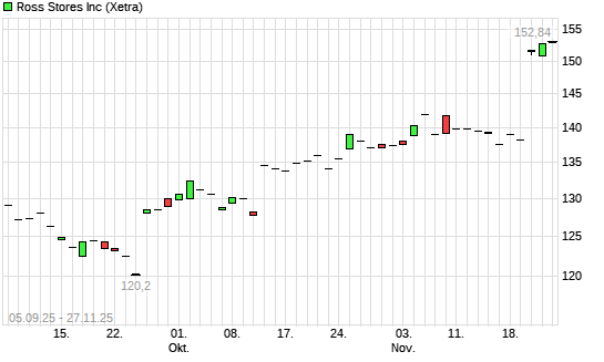 Mit dem Anstieg auf 152,26 EUR hat die Ross Stores-Aktie (ISIN US7782961038) am 26.11.2025 ein neues All-Time-High erreicht und damit den Kurs vom 24.11.2025 eingestellt.