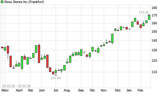 Mit dem Anstieg auf 170,18 EUR hat die Ross Stores-Aktie (ISIN US7782961038) am 19.02.2026 ein neues All-Time-High erreicht und damit den Kurs vom 18.02.2026 eingestellt.