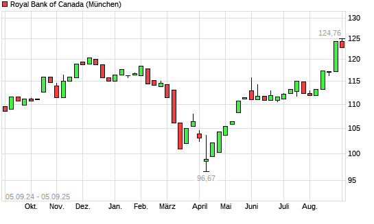 Mit dem Anstieg auf 123,76 EUR hat die Royal Bank Canada-Aktie (ISIN CA7800871021) am 04.09.2025 ein neues All-Time-High erreicht und damit den Kurs vom 01.09.2025 eingestellt.