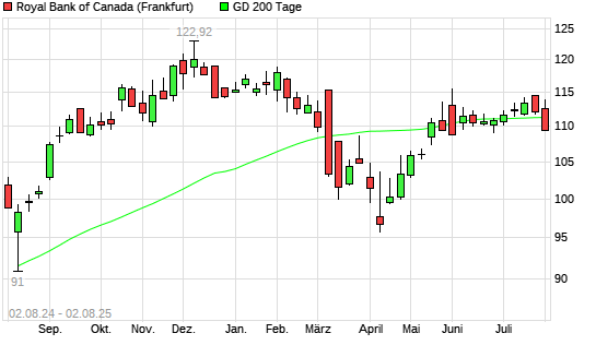 Mit dem Rücksetzer auf 109,34 EUR hat die Royal Bank Canada-Aktie am 01.08.2025 die 200-Tage-Linie nach unten gekreuzt.
