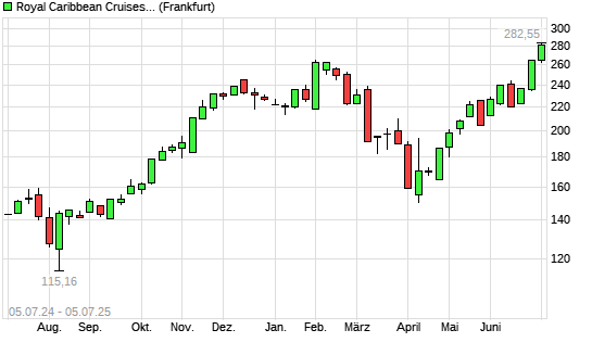 Mit dem Anstieg auf 280,75 EUR hat die Royal Caribbean Cruises-Aktie (ISIN LR0008862868) am 04.07.2025 ein neues All-Time-High erreicht und damit den Kurs vom 03.07.2025 eingestellt.