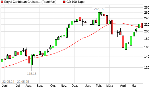 Mit dem Rücksetzer auf 209,95 EUR hat die Royal Caribbean Cruises-Aktie am 21.05.2025 die 100-Tage-Linie nach unten gekreuzt.