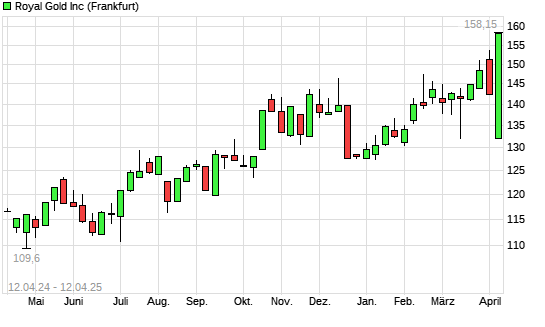 Mit dem Anstieg auf 158,15 EUR hat die Royal Gold-Aktie (ISIN US7802871084) am 11.04.2025 ein neues All-Time-High erreicht und damit den Kurs vom 10.04.2025 eingestellt.