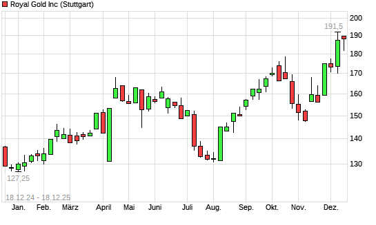 Mit dem Anstieg auf 188,35 EUR hat die Royal Gold-Aktie (ISIN US7802871084) am 17.12.2025 ein neues All-Time-High erreicht und damit den Kurs vom 11.12.2025 eingestellt.