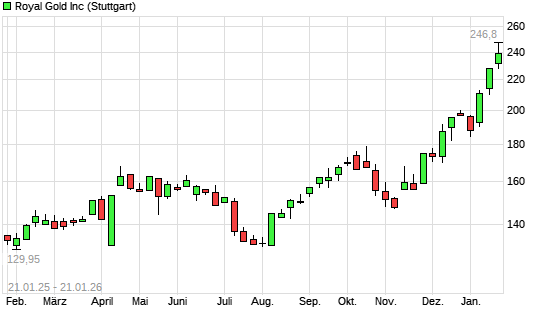 Mit dem Anstieg auf 236,40 EUR hat die Royal Gold-Aktie (ISIN US7802871084) am 20.01.2026 ein neues All-Time-High erreicht und damit den Kurs vom 19.01.2026 eingestellt.