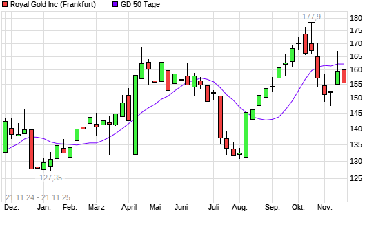 Mit dem Rücksetzer auf 159,10 EUR hat die Royal Gold-Aktie am 20.11.2025 die 50-Tage-Linie nach unten gekreuzt.