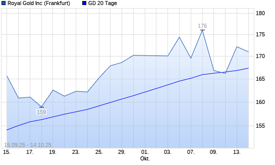 Mit dem Anstieg auf 172,20 EUR hat die Royal Gold-Aktie am 13.10.2025 die 20-Tage-Linie nach oben gekreuzt.Die Royal Gold-Aktie befindet sich seit dem 20.08.2025 im langfristigen Aufwärtstrend ...weiterlesen