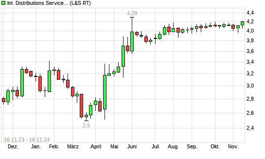 Mit dem Anstieg auf 4,15 EUR hat die Royal Mail-Aktie (ISIN GB00BDVZYZ77) am 15.11.2024 ein neues 12-Monats-Hoch erreicht und damit den Kurs vom 30.07.2024 eingestellt.