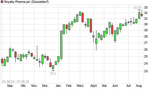 Mit dem Anstieg auf 32,55 EUR hat die Royalty Pharma plc-Aktie (ISIN GB00BMVP7Y09) am 06.08.2025 ein neues 12-Monats-Hoch erreicht und damit den Kurs vom 05.08.2025 eingestellt.