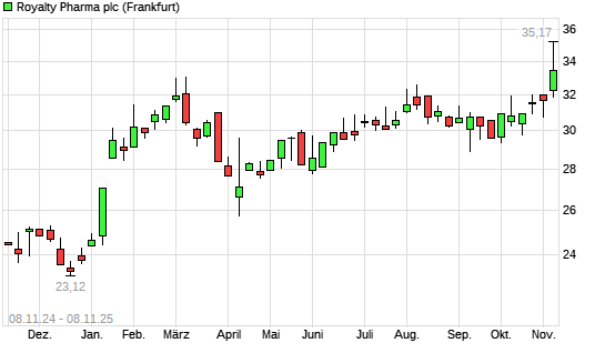 Mit dem Anstieg auf 35,13 EUR hat die Royalty Pharma plc-Aktie (ISIN GB00BMVP7Y09) am 07.11.2025 ein neues 12-Monats-Hoch erreicht und damit den Kurs vom 06.11.2025 eingestellt.