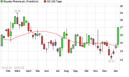 Mit dem Anstieg auf 25,09 EUR hat die Royalty Pharma plc-Aktie am 09.01.2025 die 100-Tage-Linie nach oben gekreuzt.