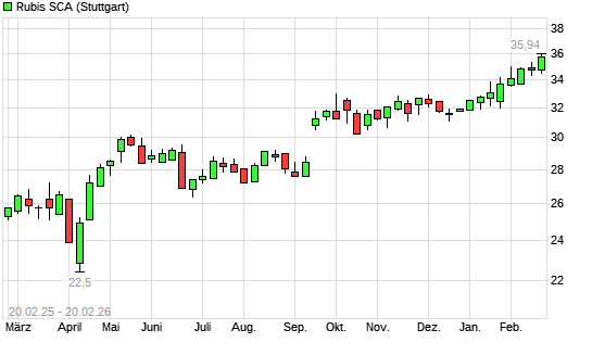 Mit dem Anstieg auf 35,34 EUR hat die Rubis-Aktie (ISIN FR0013269123) am 19.02.2026 ein neues 3-Jahres-Hoch erreicht und damit den Kurs vom 11.02.2026 eingestellt.