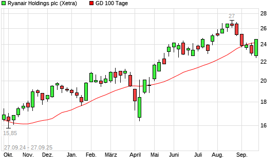 Mit dem Anstieg auf 24,45 EUR hat die Ryanair-Aktie am 26.09.2025 die 100-Tage-Linie nach oben gekreuzt.