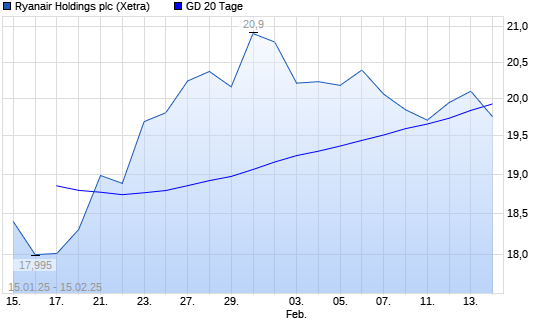 Mit dem Rücksetzer auf 19,72 EUR hat die Ryanair-Aktie am 14.02.2025 die 20-Tage-Linie nach unten gekreuzt.