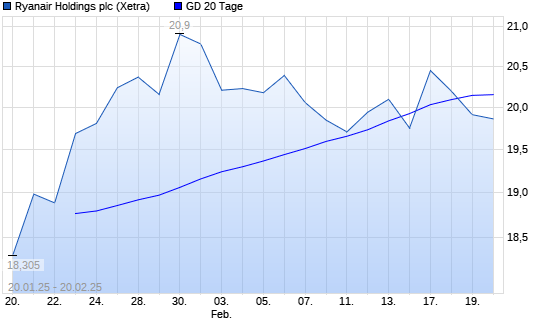 Mit dem Rücksetzer auf 19,62 EUR hat die Ryanair-Aktie am 19.02.2025 die 20-Tage-Linie nach unten gekreuzt.