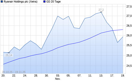Mit dem Rücksetzer auf 25,70 EUR hat die Ryanair-Aktie am 18.11.2025 die 20-Tage-Linie nach unten gekreuzt.