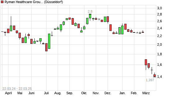 Mit dem Rücksetzer auf 1,43 EUR hat die Ryman Healthcare-Aktie (ISIN NZRYME0001S4) am 21.03.2025 ein neues 10-Jahres-Tief erreicht und damit den Kurs vom 19.03.2025 eingestellt.