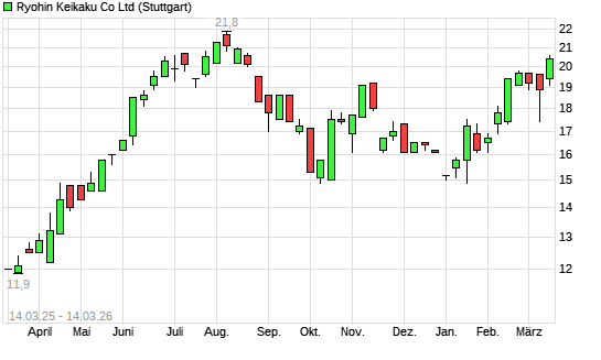 Mit dem Anstieg auf 20,60 EUR hat die Ryohin Keikaku-Aktie (ISIN JP3976300008) am 13.03.2026 ein neues 6-Monats-Hoch erreicht und damit den Kurs vom 11.03.2026 eingestellt.