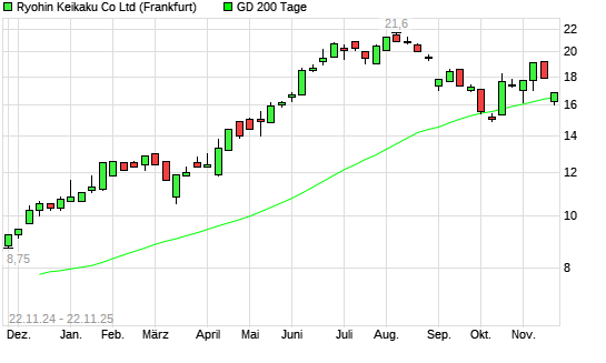 Mit dem Anstieg auf 16,80 EUR hat die Ryohin Keikaku-Aktie am 21.11.2025 die 200-Tage-Linie nach oben gekreuzt.