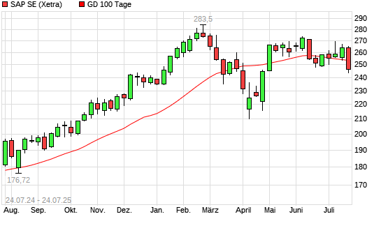 Mit dem Rücksetzer auf 248,60 EUR hat die SAP-Aktie am 23.07.2025 die 100-Tage-Linie nach unten gekreuzt.