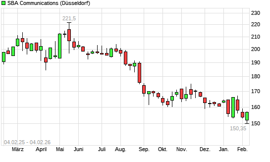 Mit dem Rücksetzer auf 152,30 EUR hat die SBA Communications-Aktie (ISIN US78410G1040) am 03.02.2026 ein neues 5-Jahres-Tief erreicht und damit den Kurs vom 29.01.2026 eingestellt.