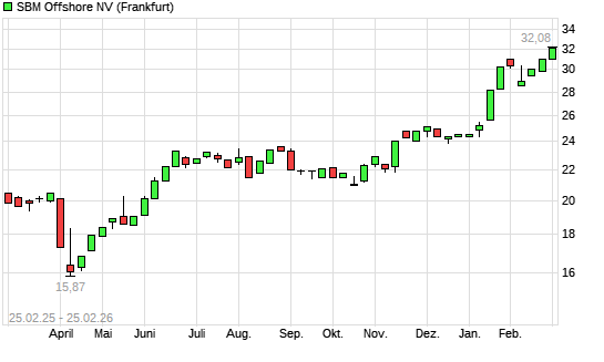 Mit dem Anstieg auf 31,94 EUR hat die SBM Offshore-Aktie (ISIN NL0000360618) am 24.02.2026 ein neues All-Time-High erreicht und damit den Kurs vom 23.02.2026 eingestellt.