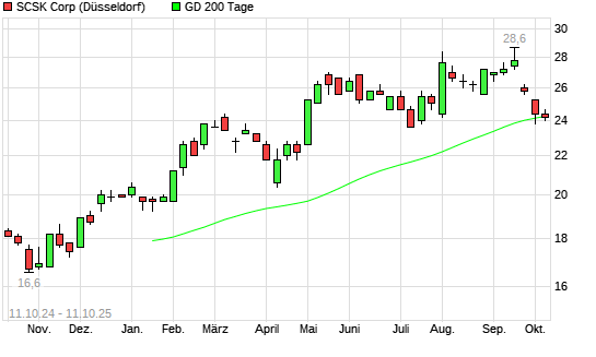 Mit dem Rücksetzer auf 24,40 EUR hat die SCSK-Aktie am 10.10.2025 die 200-Tage-Linie nach unten gekreuzt.