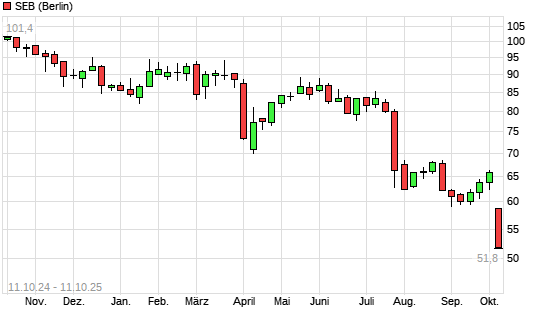Mit dem Rücksetzer auf 51,70 EUR hat die SEB-Aktie (ISIN FR0000121709) am 10.10.2025 ein neues 10-Jahres-Tief erreicht und damit den Kurs vom 07.10.2025 eingestellt.